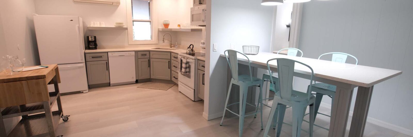All Cottages include: air conditioning, televisions in living and bedrooms, kitchens with refrigerator, stove, microwave, coffee pot, dishes/glasses/cooking utensils, (kitchenette in studio 4 – no stove). Cottages 1, 2, 6 & 8 have newly remodeled kitchens with dishwasher.